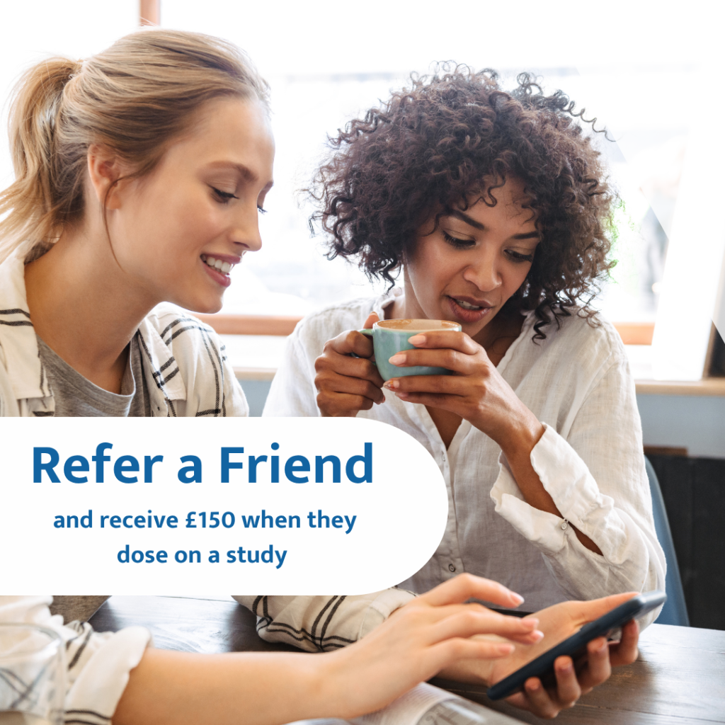 All you have to do is ask your friend to quote your name when they register with us, and when they dose on their FIRST study, you’ll receive a £150 payment as a thank you.